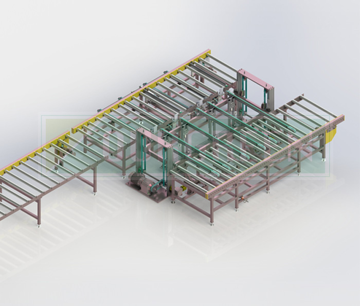 南京歐格設計制造的后續自動化生產線使用機械推手將板材推入碼垛堆疊,堆疊成包裝要求高度,輸出打包。